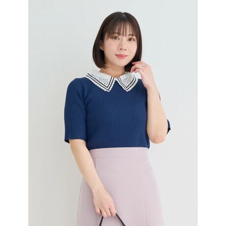 襟レースのクラシカル感が新鮮なリブニットトップス