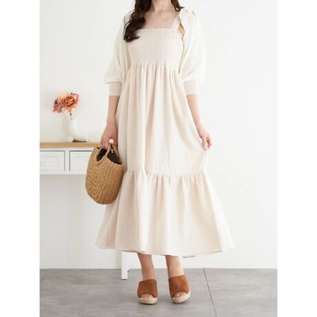 肩リボンシャーリングワンピース