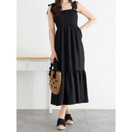 肩のリボンとフレアなシルエットがフェミニンムードなワンピース。