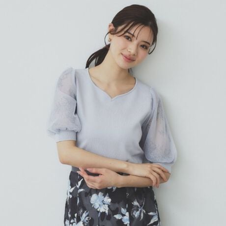 チュール重ねのレーススリーブが華やかなニットトップス