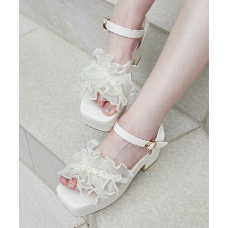 シアーフリルにパールリボンをプラスしたフェミニンムード高まるサンダル。