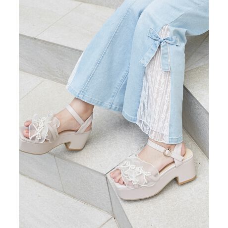 シアーフリルにパールリボンをプラスしたフェミニンムード高まるサンダル。