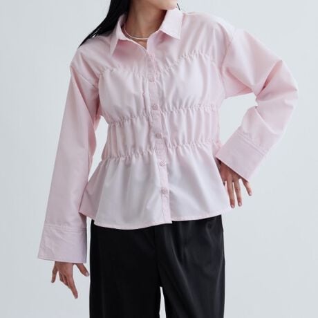 シャーリングデザインのこのブラウスは、可愛さとカジュアル感を両立。