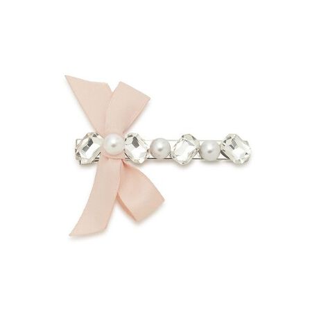 クリアなビジューとパールに、上品なサテンリボンのワンポイントを加えた華やかなヘアピンです。