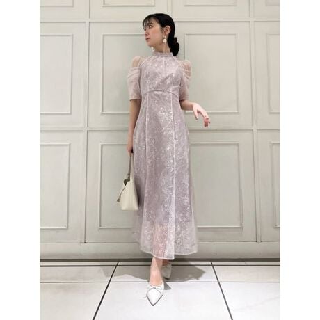 スパンコール付きのレース生地を使用したドラマティックなドレスがお目見え。肩周りをアメスリ位置で柄なしのシアーチュール生地に切り替え、デコルテ周りをエレガントに演出しました。袖はタックを入れたレース生地に切り替え、ふんわりとロマンティックな印象です。腰回りはすっきり見えるようにデザインし、高めの位置で切り替えが入っているので、スタイルアップの効果も期待大です。裾にかけてフレアのシルエットが綺麗に出るように、こだわって仕立てました。バッグは深めのスリット開きでさり気ない抜け感を演出。背中側のファスナーで着脱いただけます。袖以外にはほのかに光沢のある裏地を付け、立体感を出しました。