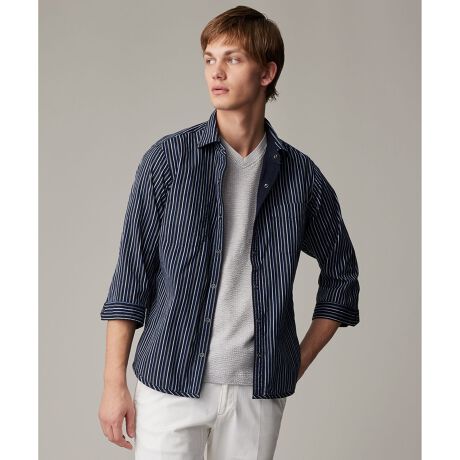 ■素材オーガニックコットンを使用した夏の定番の7分袖シャツです。今期は細番手の糸を使用し、従来よりも肉感を薄く仕上げました。裏面にデザインされたストライプは、色を加え、サッカー組織でほんのり凹凸感のある印象を際立たせています。柔らかく肌触りが良いので、夏の羽織りとしても非常に使いやすいです。