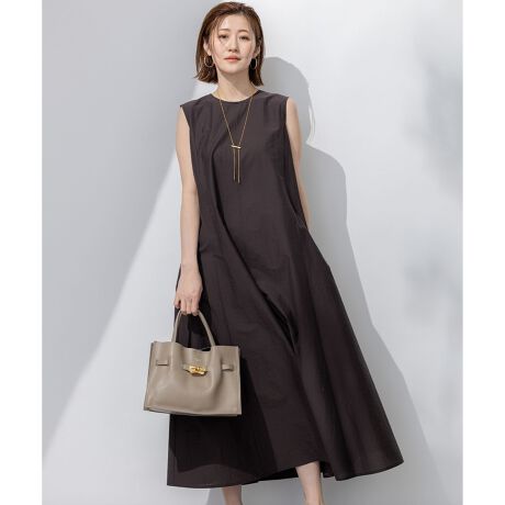 裾に向かってフレアが広がるノースリーブワンピース。シンプルなクルーネックで、上半身はすっきりコンパクトな作りにこだわり、1枚で着ても華奢見えするカッティング。羽織りアイテムを合わせてもかさばらないデザインに仕上げています。同素材のジャケット(品番:JKWOGM0506)とのセットアップスタイルも楽しめます。ペチスカートつき。カラーは、甘さを抑えた大人エレガントな雰囲気のあるキャメル(#034)、暑い時期にも落ち着いた洒落感をくれるダークブラウン(#035)の2色展開です。