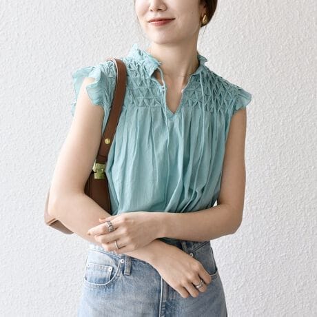 首元の紐は、垂らした状態でこなれ感を、リボン結びにしてフェミニンに着こなしたりと気分に合わせてアレンジを楽しめます。