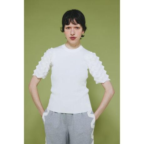 着心地のいいニット素材でシャリ感があり、夏場も重宝するアイテムスリーブの凹凸感はデザイン性があり、どんなアイテムにも合わせやすいトップスです。ソーンスリーブニットトップス[注意事項] ※画像の商品はサンプルです。実際の商品と仕様、加工が若干異なる場合があります。 ※画像の商品は光の照射や角度、お使いのモニター環境により、実物と色味が異なる場合がございます。 ※着用、お取り扱いの際は、アテンションタグをご確認ください。