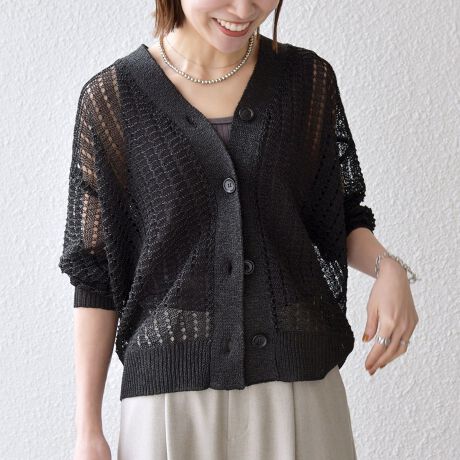 透かし編みで表現した表情のある編み柄がポイントのサマーニットカーディガン。