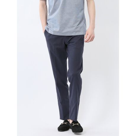 すっきりとしたノータックのテーパードパンツです。センタープレス加工により、キチンと感のあるクリーンな印象に仕上げています。ウエストストレッチで着脱もスムーズ、着席時も窮屈感がありません。裾部分は未加工です。