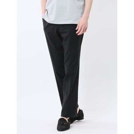 すっきりとしたノータックのテーパードパンツです。センタープレス加工により、キチンと感のあるクリーンな印象に仕上げています。ウエストストレッチで着脱もスムーズ、着席時も窮屈感がありません。裾部分は未加工です。
