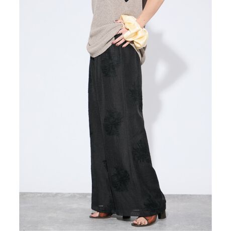 シアーな生地に花柄の刺繍が入ったイージーパンツに、薄手のサテンのイージーパンツがレイヤードされている2WAY仕様のパンツ。インナーパンツは内側のボタンで取り外し可能です。