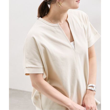 ONOFFで着用可能なシンプルなデザインながら、スキッパータイプの首元やラウンドヘムになったお裾はカジュアルになりすぎないポイントになっています。