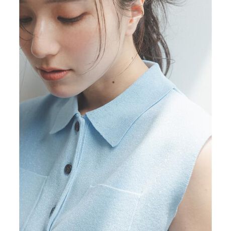 華やかで繊細なラメ糸を使ったポロ襟ディテールがポイントのノースリーブニットです。肩先にそっとかかる袖丈や体のラインを拾いにくいシルエットがこれからの季節にぴったり。ワイドパンツやスカートなど、様々なボトムスと着用いただけます。<素材>シャリッとした清涼感のある糸を使用しています。<詳細>仕様・前ボタン裏地・なし透け感・なし / 光沢・あり / 伸縮性・あり生地の厚さ・普通※モデルの着用画像の場合、光の当たり具合により、実際の色味と異なって見えることがございます。色味は、商品単体の画像をご参照ください。