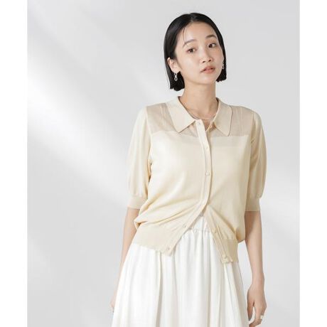 シンプルなルックスで上品さも兼ね備えたサマーニット。トレンド感のある衿付きとシアーな素材感が今年らしい一着。釦の開き具合で着こなしに変化を付けるスタイルがおすすめです。