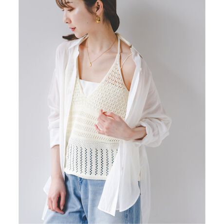 レースのような異なる編み目を組み合わせた透け感を楽しむホルターネックキャミ。