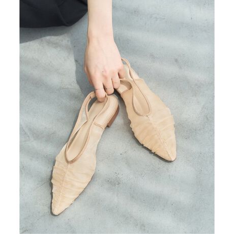 トレンドのシアー素材を使用し、たっぷりと寄せたギャザーの立体感が目を引くスリングバックシューズ。