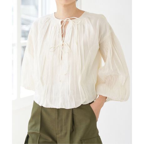 透け感のあるコットンボイル生地を、シャーリングとたっぷりのギャザーを寄せてバルーンシルエットに仕上げたブラウス。