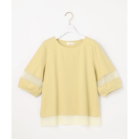 ・袖と裾に透け感のあるチュールを施した着映えカットソー・立体的なフォルムのランタンスリーブ・気になる二の腕をカバーしつつ、さりげなく透けるチュール部分が軽さを演出