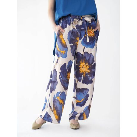 大柄プリントを施した艶感感じる逸品。コントラストを効かせたカラーが一着で様になるアイテム。ウエスト周りは総ゴム仕様かつリボンベルトのお好みで調節可能なところが魅力のポイント。これからの季節に着用したくなる品を兼ね揃えたデザインパンツです。