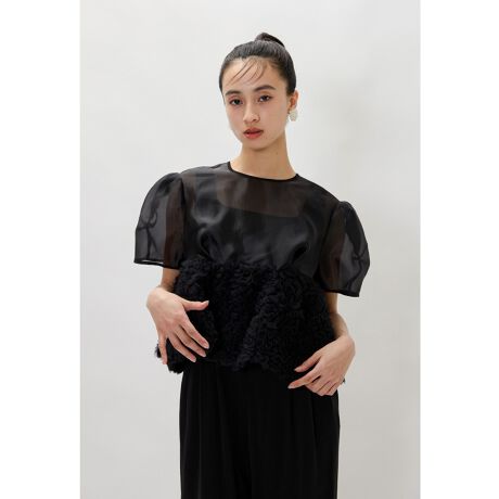 オーガンジー素材のライトなボリューム感とドロップさせたパフスリーブで