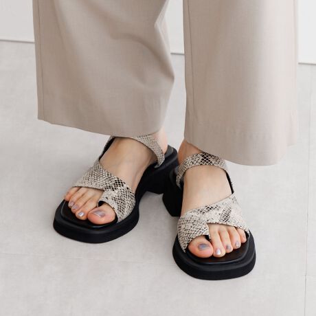 甲にかかるベルトの内側にはゴムが内蔵されており、しっかりと足にフィット。程よいボリューム感のソールが今季らしい一足です。カラーもモード感のあるブラック、シルバー、パイソン柄のブラック型押の3色展開。履くだけで抜け感とトレンド感を叶えてくれるフラットサンダルです。