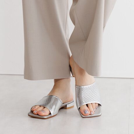 上質なレザーにパンチング加工を施したフラットミュールサンダル。