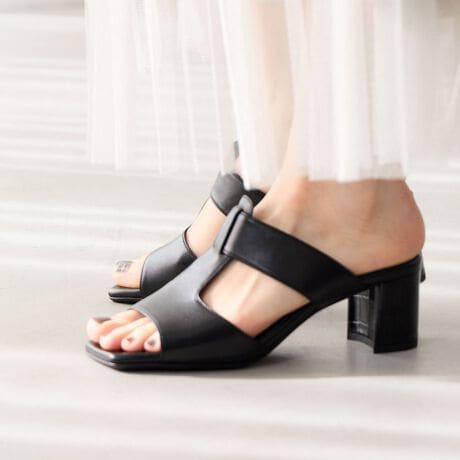 サイドのカッティングが程良い抜け感のあるミュールサンダル。