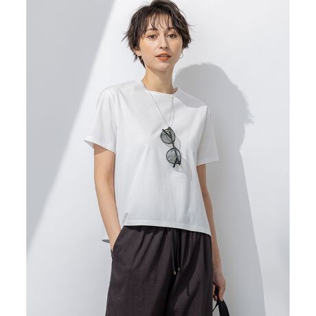 ミニマルなクルーネックの半袖Tシャツ。程よく肩のラインがドロップして、大きすぎないシルエットなので一枚で着るのはもちろん、キャミワンピースやオールインワン、デザインキャミソールのインナーにもぴったりです。程よいハリとツヤ感の大人Tシャツで、着回ししやすい便利なアイテム。カラーは、爽やかなホワイト(#001)、印象引き締まるブラック(#005)、パッと目を引くマゼンタ(#011)、洗練された雰囲気のダークブラウン(#035)の4色展開です。