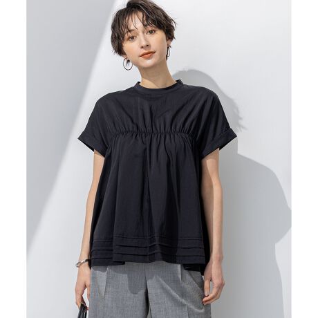 胸元のゴムギャザーと裾のピンタックでアクセントをつけたデザインブラウスです。 ゆとりのあるシルエットですが、胸下あたりに柔らかいゴムギャザーを寄せてすっきりと見えるようにしています。 落ち感のある肌離れのいい素材なので横に広がらず、暑い夏に1枚で快適に過ごしていただけます。腰回りをカバーしれくれるレングスなので。細身のボトムと合わせるとよりスタイルアップが叶います。トレンドのワイドパンツを合わせたスタイリングもおすすめです。カラーは爽やかな印象のホワイト(#001)、抜け感のあるダークブラウン(#035)、モードな雰囲気のブラック(#005)、差し色にもおすすめなラベンダー(083)4色展開です。