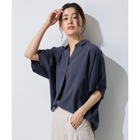 ・袖口のタックデザインがさりげないポイントのブラウス・スキッパーネックで顔周りをすっきりとした印象に・使いやすい無地からストライプまで、お気に入りが見つかる多色展開
