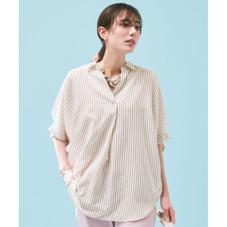 ・袖口のタックデザインがさりげないポイントのブラウス・スキッパーネックで顔周りをすっきりとした印象に・使いやすい無地からストライプまで、お気に入りが見つかる多色展開