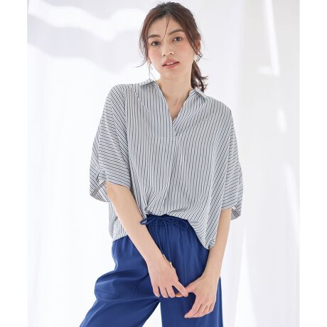 ・袖口のタックデザインがさりげないポイントのブラウス・スキッパーネックで顔周りをすっきりとした印象に・使いやすい無地からストライプまで、お気に入りが見つかる多色展開