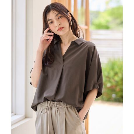 ・袖口のタックデザインがさりげないポイントのブラウス・スキッパーネックで顔周りをすっきりとした印象に・使いやすい無地からストライプまで、お気に入りが見つかる多色展開