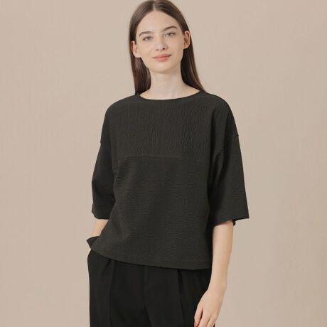 涼し気な素材感を生かした半袖ブラウスです。ゆとりのあるシルエットながら、切り替え位置でダーツ処理をし、着心地も良くシャープな印象になる様仕立てています。
