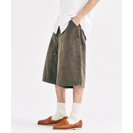 ダブルニー型の重厚なワークパンツ型で腰回りはスッキリと、裾に向かってズドンと太いワイドショーツ。ウエストはサイズ調整できるので女性にもオススメのパンツです。
