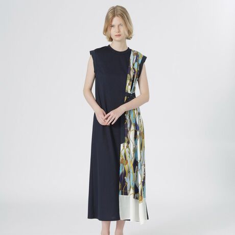 ドレスの左サイドには、LOVELESSオリジナルのスカーフ柄をプリントしたオリジナルのテキスタイルを使用。