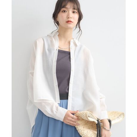 ナイロン混で程よいハリ感もあるシアー素材で仕立てたデザインシャツ。身幅を広くとった短丈ワイドシルエットがこなれ感ある一枚です。上品な透け感でレイヤードを女性らしく演出し、エアリーな前後差あるヘムラインもポイントに。どんなボトムとも相性が良く様々なシーンで活躍してくれるおすすめのアイテムです。透け感[あり]