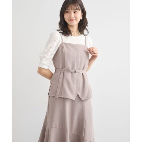 ビスチェを大胆にドッキングした着映えワンピース。バックのシャーリングや斜めに切り替えた裾のフレアシルエットが女性らしさを引き立ててくれます。ウエストのベルトでアクセントをプラス。シンプルなインナーを合わせるだけできれいめなレイヤードのスタイリングが決まるおすすめアイテムです。透け感[なし]