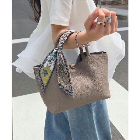 ハンドルには取り外しできるスカーフが結んであり、シンプルな装いに上品なアクセントをプラス。