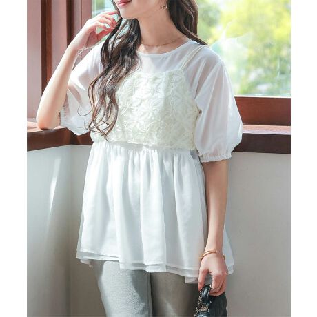 ふんわりとしたシアーブラウスと、立体的なフラワーモチーフが華やぎを添えるキャミソールの2点セット。