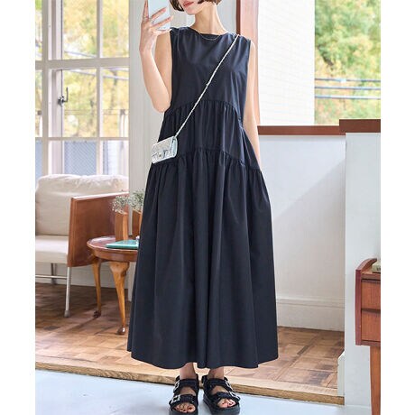 デコルテをきれいに見せるラウンドネックと、裾にかけて広がるティアードシルエットが女性らしさを引き立て、華やかな印象に。