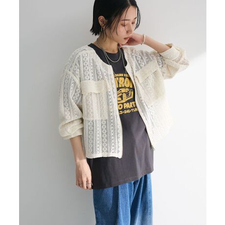 ナチュラルな雰囲気のレース素材で仕立てたブルゾン。袖口カフスや胸ポケットを施しシャツのようなアクセントをプラスして、上品で女性らしいデザインに仕上げました。ノーカラーの首元が顔周りをすっきりと演出。スカートやスラックス、ワンピースにも合わせやすく、様々なテイストにマッチするおすすめのアイテムです。