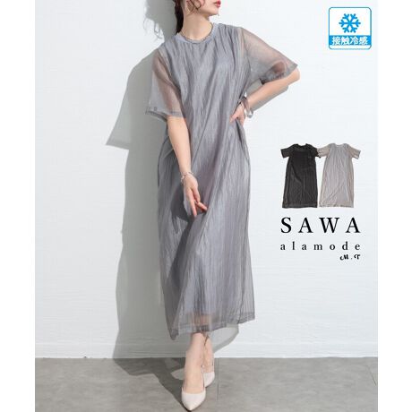 【ワンピース】 接触冷感 カットソー 異素材 シフォン 半袖 ロング レイヤード 黒 グレー 春 夏