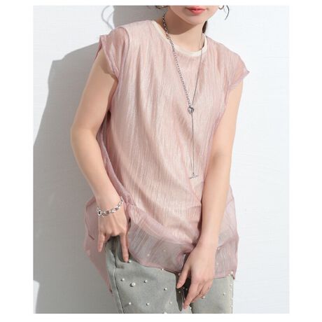 ベーシックなノースリーブカットソーに、シアーなシフォンをレイヤードしたようなトレンド感溢れるトップス。ノースリーブに抵抗のある世代にも、オーバーサイズ感のあるシフォンが重ねられ、二の腕をさり気なくカバーしてくれるから大人世代にも着こなしやすい一枚。軽やかなシフォンが爽やかで軽快な印象を演出し、ワンツーコーデでもトレンド感のあるスタイリングに。伸縮性のあるカットソー地で動きやすく、ゆったりとしたシフォン生地がヒップラインまでカバーします。すっきりとした丈感のカットソー生地だからボトムスを選ばず、二の腕や裾のシフォンの透かしが抜け感をプラスします。シンプルだからスタイリングに取り入れやすく、トップでもインナーでも着こなせる一枚。
