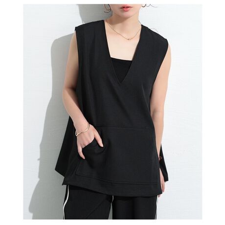 【トップス】 ベスト ジレ Vネック フレア カンガルーポケット 重ね着 無地 ブラック グレー