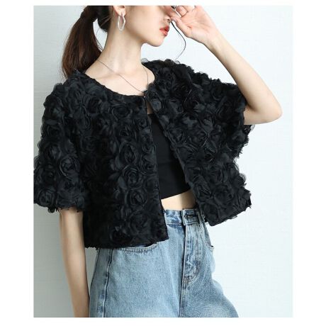 【カーディガン】 トップス ボレロ 黒 ブラック 半袖 ショート丈 チュール 花柄 フラワー 結婚式