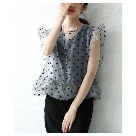【カットソー】 トップス プルオーバー 黒 ブラック グレー ノースリーブ ドット柄 水玉 フリル