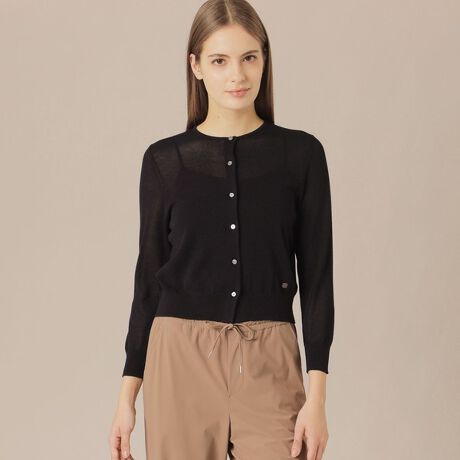 シンプルなニットショートカーディガンです。首に沿った小さな衿開きが繊細で、前立ての小さな釦もアクセントになっています。短い着丈と八分丈の袖が軽く涼しげな印象で、夏の羽織として活躍します。